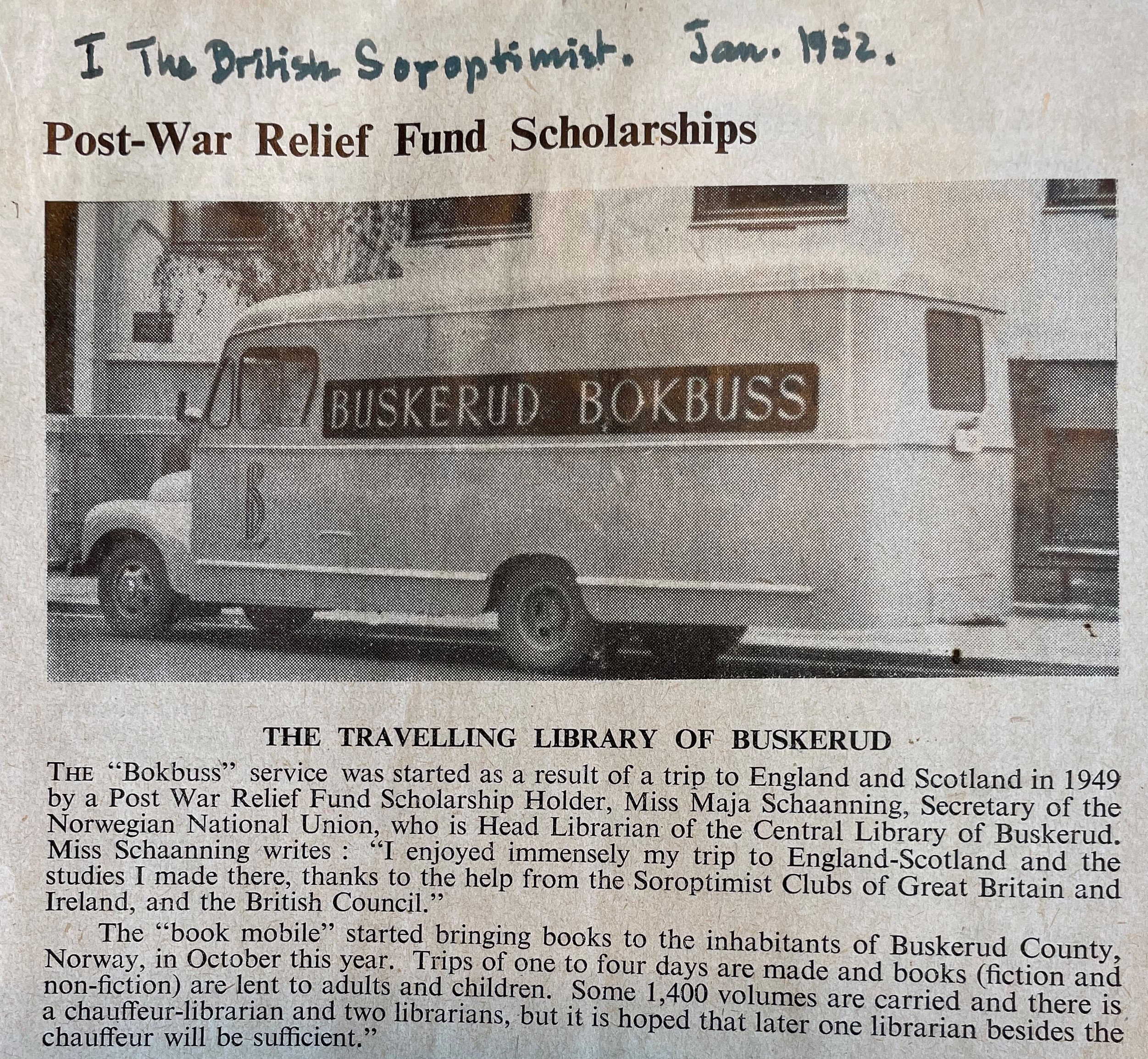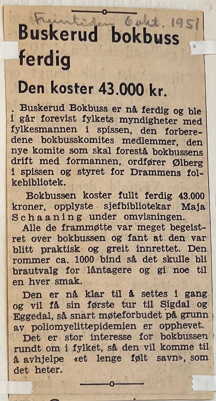 Den første bokbussen i Norge begynte å kjøre i Vestfold i 1948, og bokbusstjenesten ble etter hvert en viktig kultur- og kunnskapsformidler over hele landet. I 1949 reiste biblioteksjefen i Buskerud, Maja Schaanning på en studiereise til Storbritannia for å lære mer om bokbussdrift. Schaanning var for øvrig utdannet ved New York Library School, og gjennomførte flere studiereiser i Europa for å kunne gjøre det norske folkebiblioteket best mulig. Før hun ble biblioteksjef for Buskerud var hun sjefsbibliotekar i Trondheim og Kristiansand. I oktober 1949 bevilget fylkestinget 45 000 kr til bokbussen og arbeidet med å få bygd et rullende bibliotek startet.