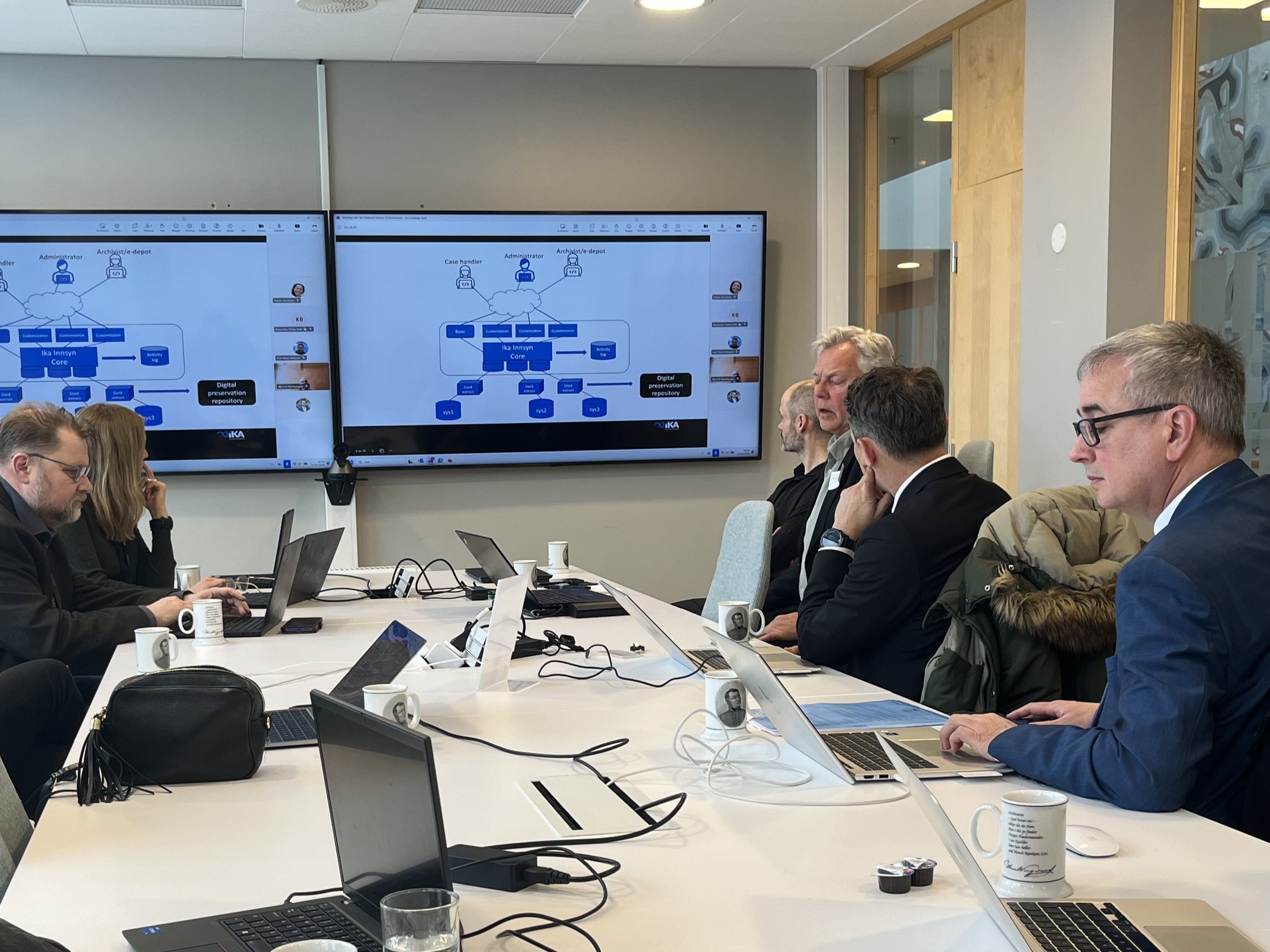 I den tekniske delen av møtet demonstrerte vår utvikler Pelle Iversen IKA Innsyn for Familia. Delegasjonen fra Sveits uttrykte interesse, og det ble videre diskutert utviklingsløp, bruk av SIARD-uttrekk og muligheter for samarbeid i et utviklerforum. SIARD-formatet, som benyttes for langtidsbevaring av relasjonsdatabaser, er utviklet av Det sveitsiske føderale arkiv, og assisterende direktør Kwasnitza har i en årrekke vært sentral i dette arbeidet.